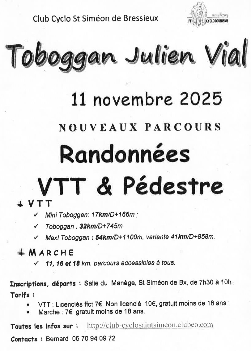 Proposé par le club de cyclotourisme Randonnée VTT (17, 32 et 54 km) et pédestre (11, 16 et 18 km)