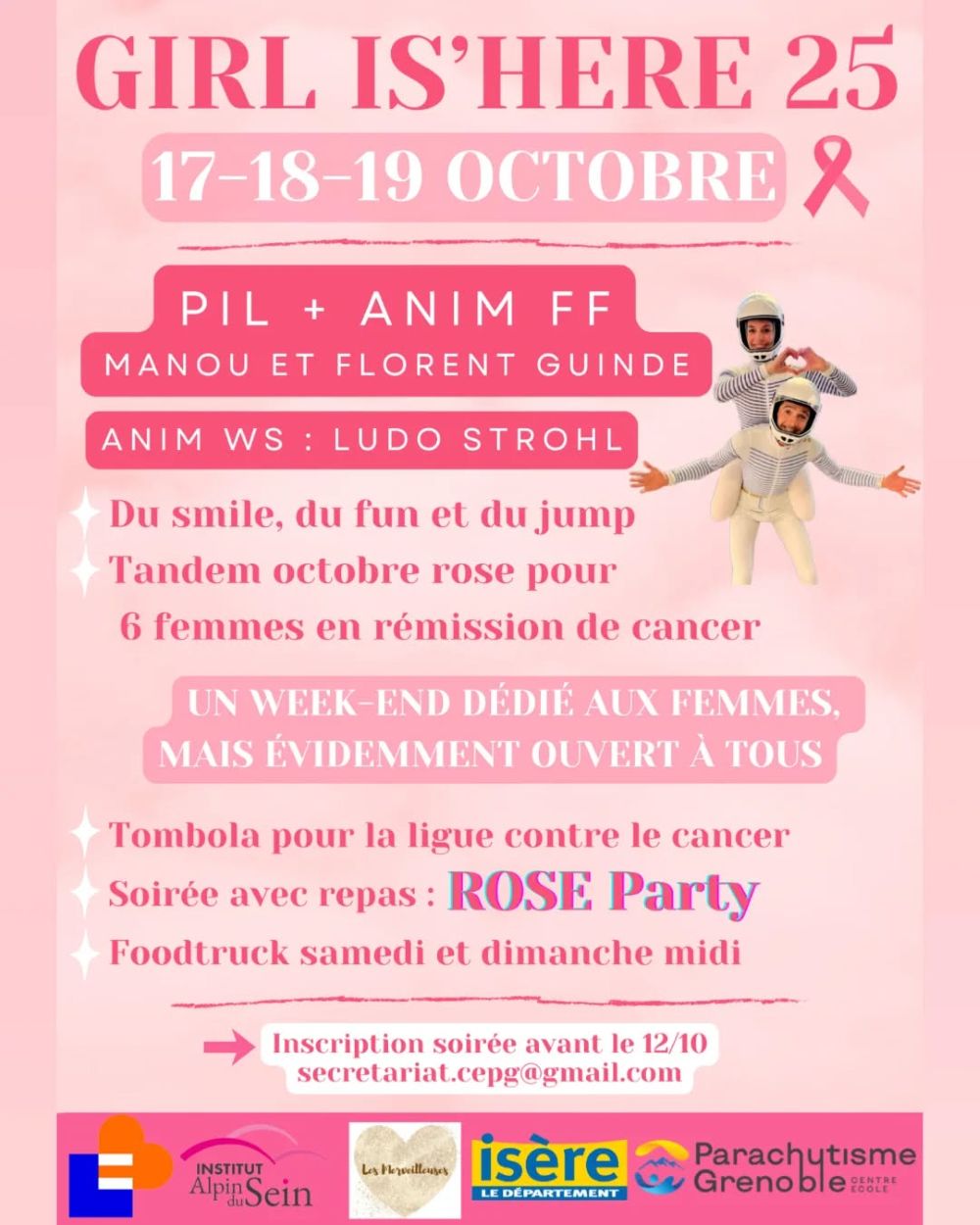 Proposée par le Centre Ecole de Parachutisme de Grenoble Save the date pour notre rendez-vous annuel dans le cadre d'Octobre Rose ! Pilatus, tombola, animations, bonne humeur et solidarité au programme ! Durée : 3 jours