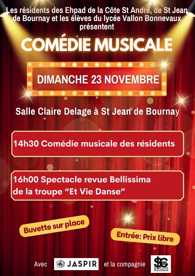 Les résidents des Ehpad de la Côte Saint André et de l’Ehpad de la Barre de Saint Jean de Bournay sont fiers de vous présenter le fruit d’un projet artistique et humain hors du commun : une comédie musicale créée et interprétée par les résidents, avec la participation des élèves du lycée Ballon Bonnevaux de St Jean de Bournay. Ils ont été accompagnées par la talentueuse compagnie des Sœurs Goudrons, collectif d’artistes professionnels et l’association Jaspir.