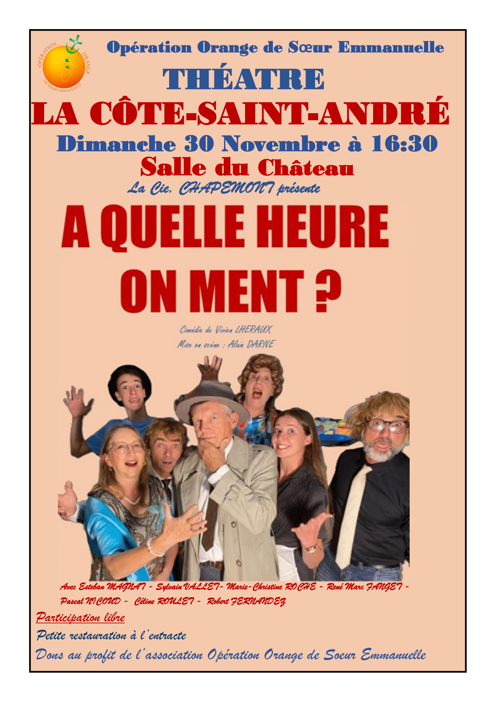 Proposée par l'Opération Orange avec Soeur Emmanuelle La pièce est intitulée : A quelle heure on ment ? Elle sera donnée par la Compagnie Chapemont qui est une troupe de La Chapelle de Surieu et Montseveroux. Avec petite restauration