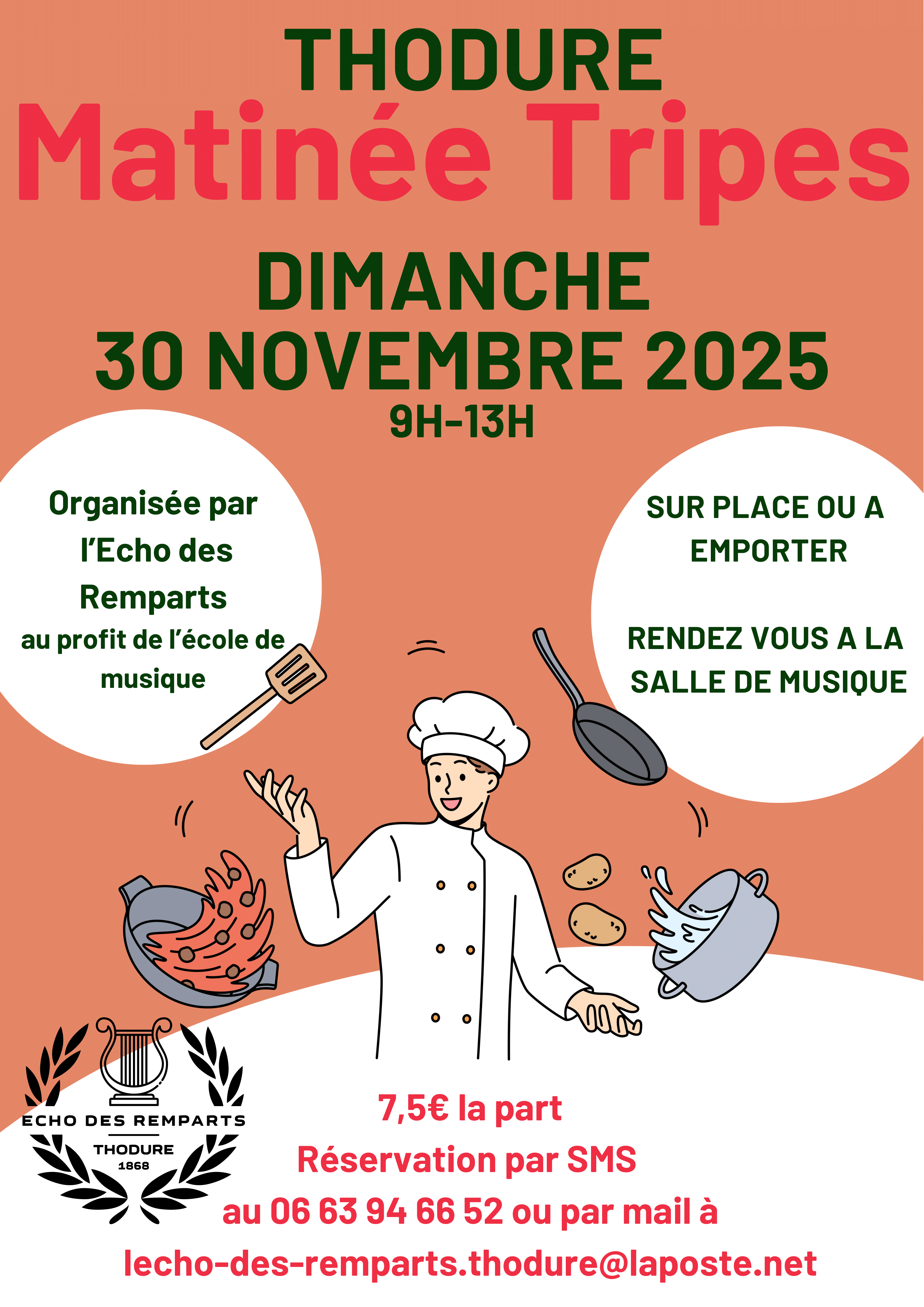 Organisée par l"écho des remparts Au profit de l'école de musique Sur place ou à emporter, réservation par sms