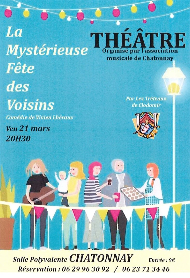 Organisée par l'association musicale, soirée théâtre avec la comédie 'La Mystérieuse Fête des Voisins" de Vivien Lhéraux, jouée par les tréteaux de Clodomir.