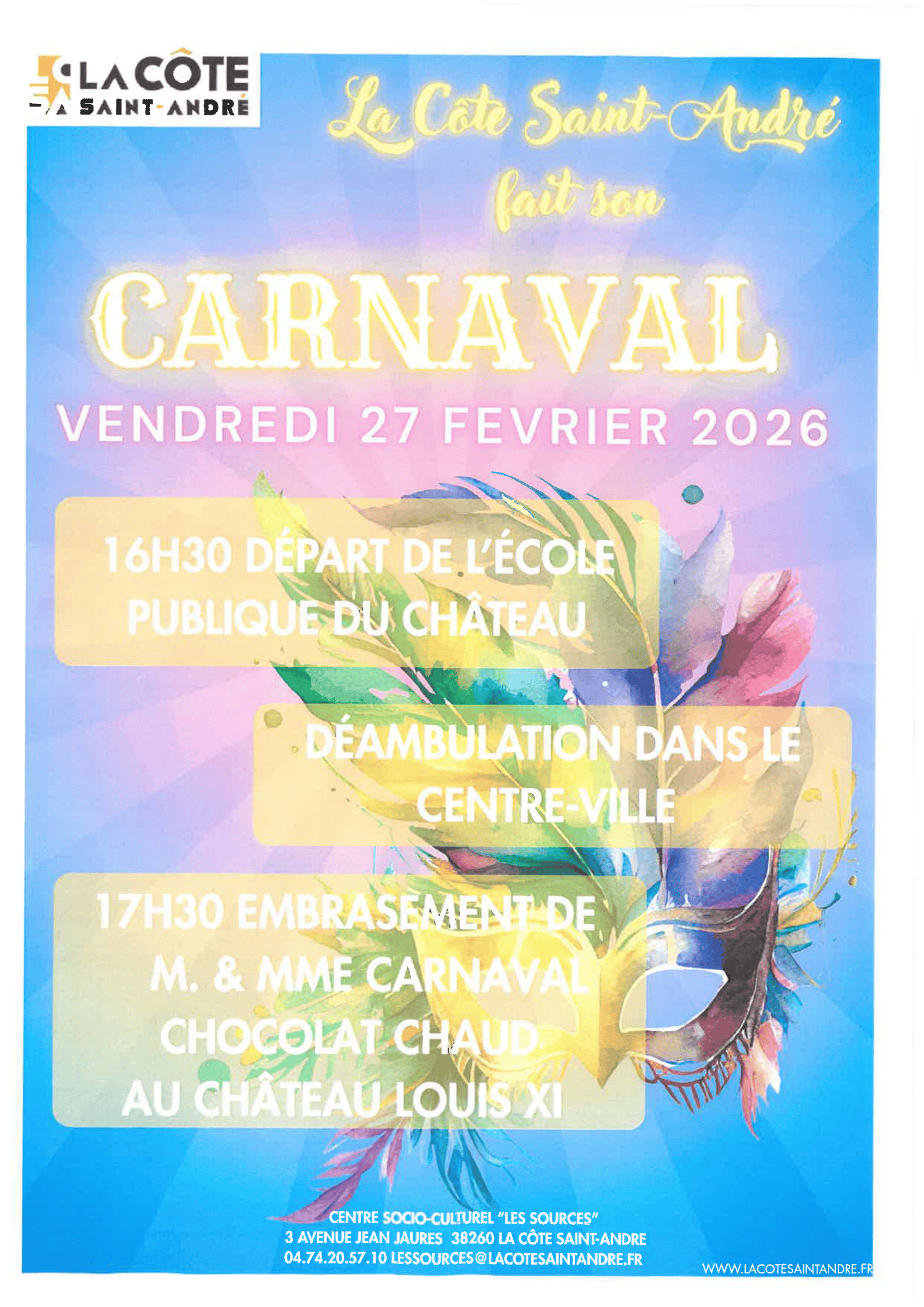 Proposé par le centre socio-cultutel les sources 16h30 départ déambulation dans le centre ville 17h30 embrasement M et Me Carnaval Avec chocolat chaud au château Louis XI