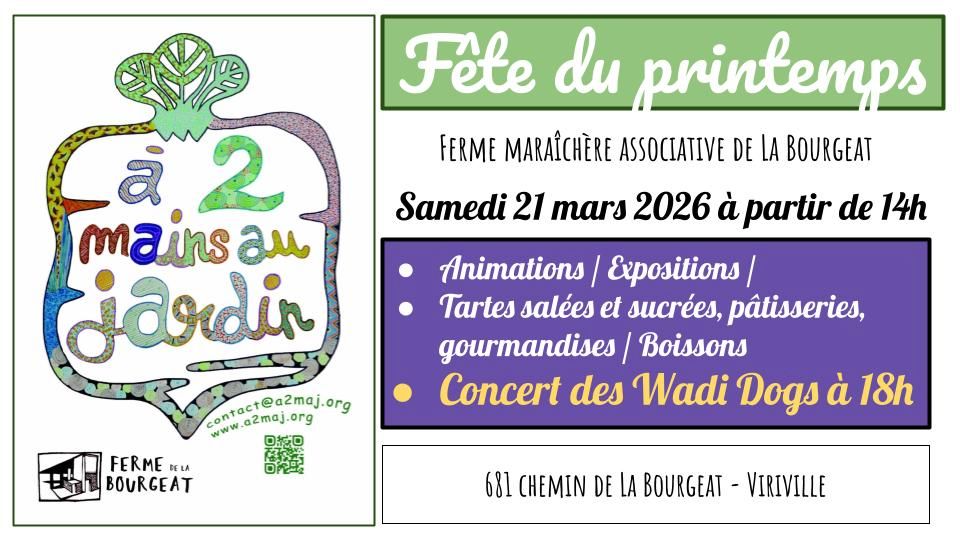 Célébration du printemps et découverte de la ferme associative A 2 Mains Au Jardin : animations autour du maraîchage sur sol vivant et de la biodiversité. Concert des Wadi Dogs à 18h, buvette et petite restauration.