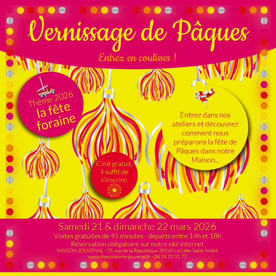 Pour découvrir notre thème de l’année et les coulisses de notre chocolaterie pendant la fête de Pâques, inscrivez-vous à notre Vernissage de Pâques. C’est gratuit et gourmand