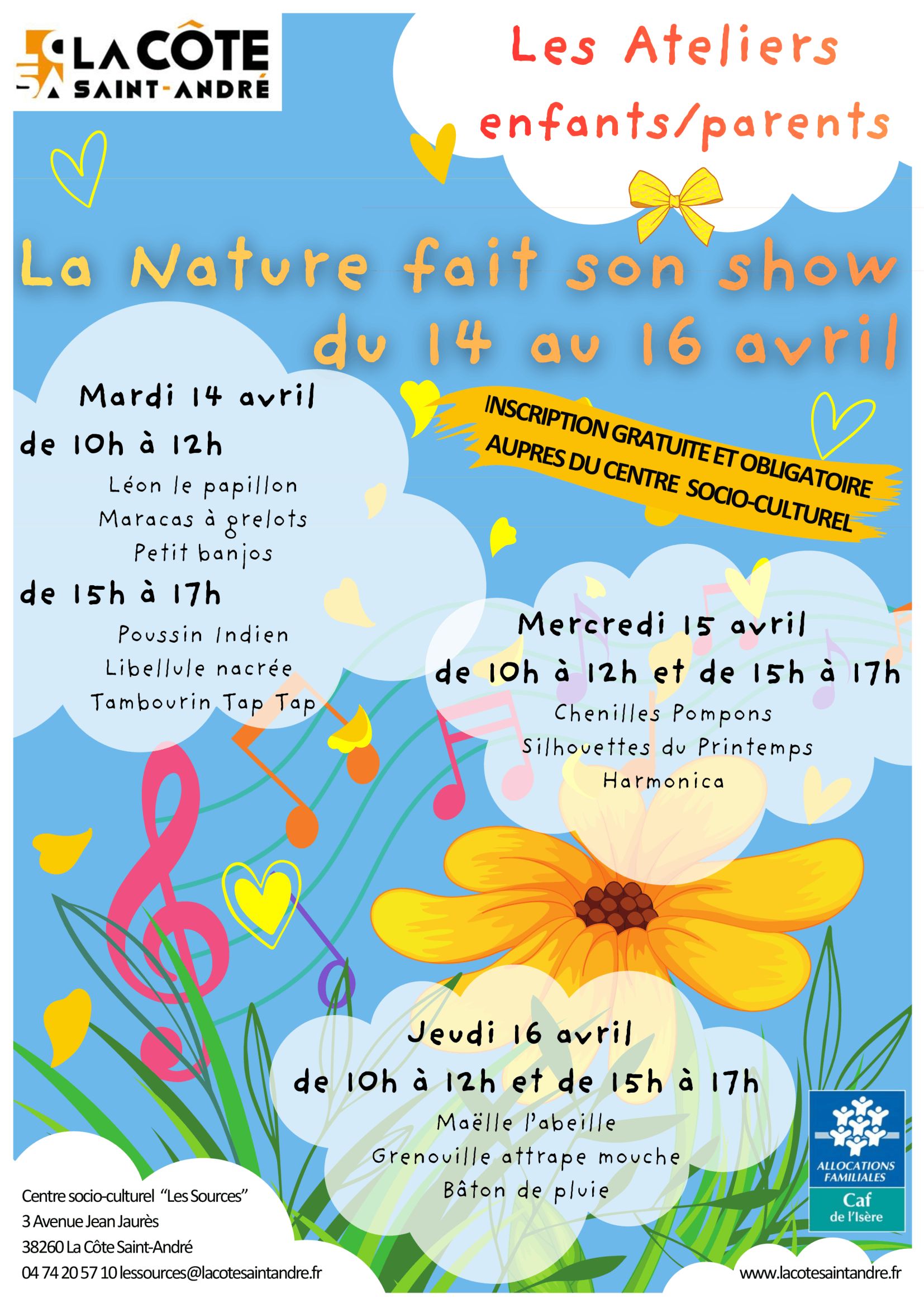 Proposé par le centre socioculturel les Sources La nature fait son show Chenilles pompons Silhouettes du printemps Harmonica L’occasion de partager un bon moment en famille (parents/enfants, grands-parents/petits enfants .