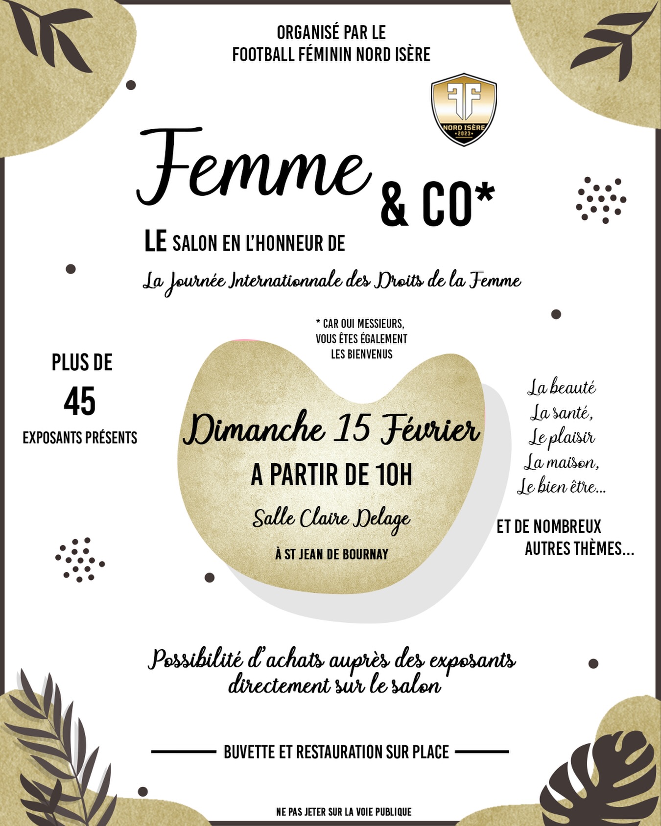 Proposé par FFNI (Football Féminin Nord Isère), salon Femmes & Co avec 45 exposants sur le thème de la beauté, santé, plaisir, maison, bien-être... Buvette et restauration sur place.