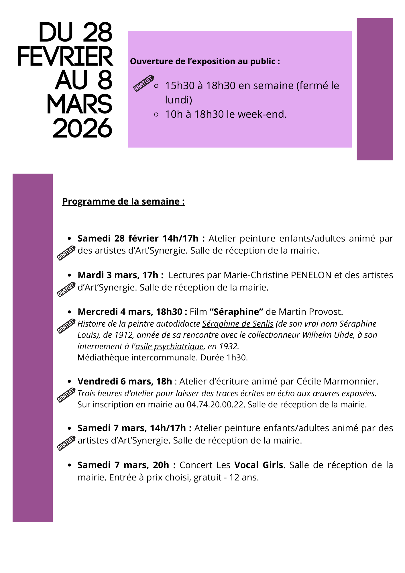 Dans le cadre de leurs 3ème rendez-vous artistiques en lien avec la journée internationale des droits des femmes, Art'Synergie, collectif d'artistes en Pays de Berlioz, en partenariat avec la commission culture et animation de la mairie de Saint Siméon de Bressieux, organise une exposition artistique du 28 février au 8 mars 2026.