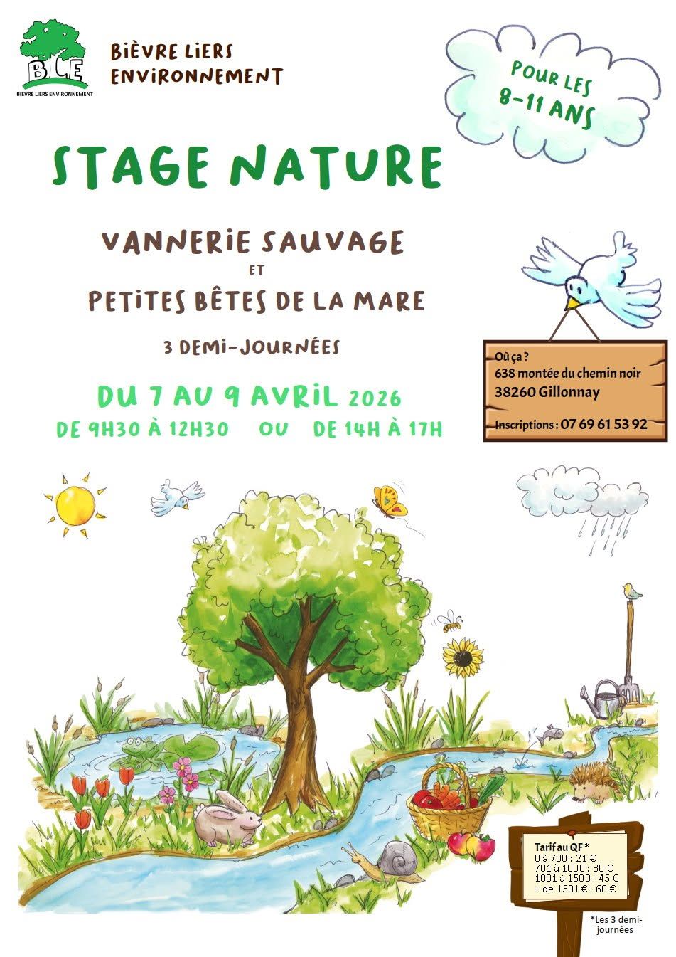 Proposé par Bièvre Liers environnement Pour les 8-11 ans Stage encadré par des professionnelles, dans un espace naturel diversifié pour découvrir la nature en s'amusant et en créant. Vannerie sauvage et petites bêtes de la mare 3 demi journées