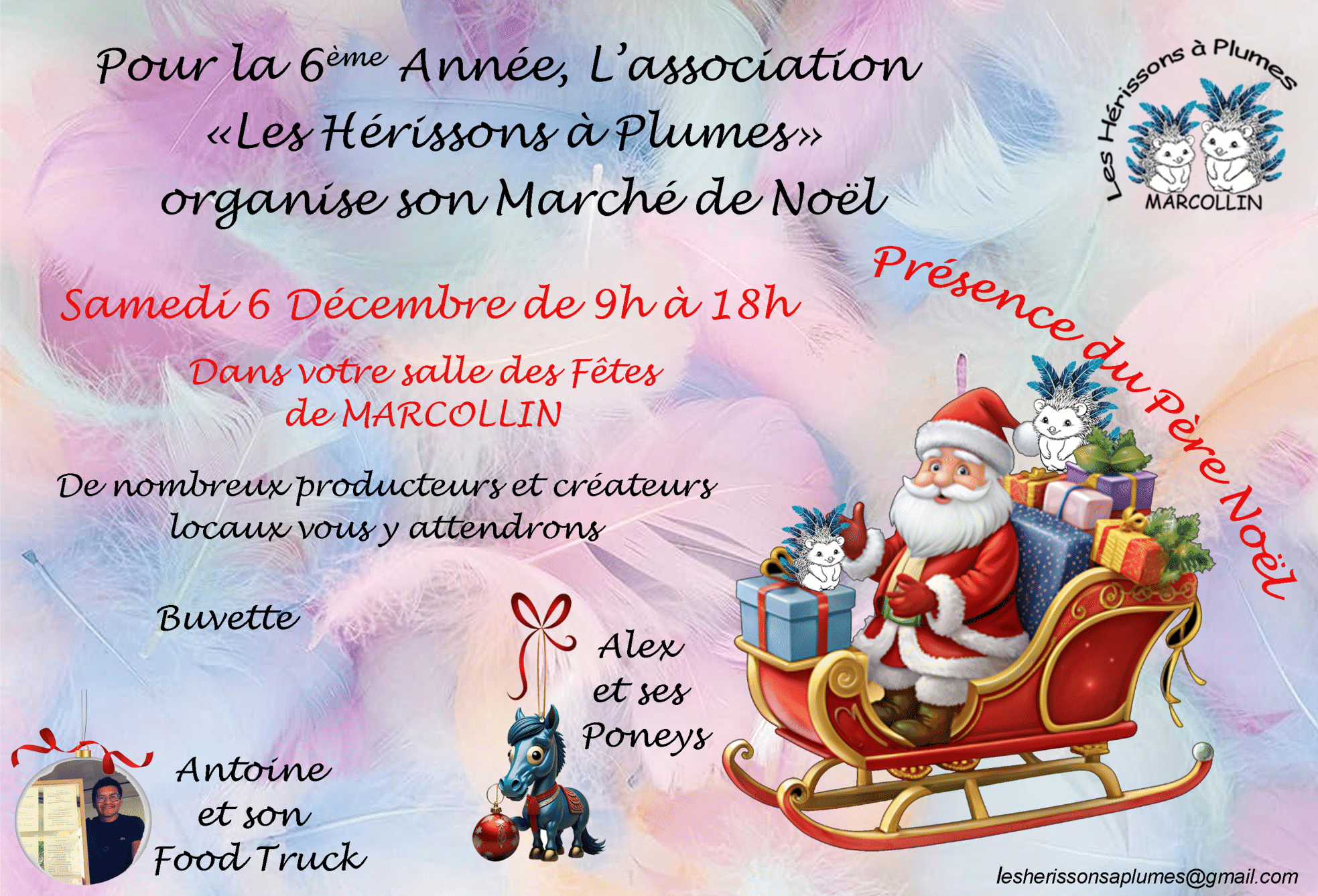 Proposé par les hérissons à plumes Avec la présence de : nombreux créateurs et producteurs locaux Alex et ses poneys Antoine et son food truck Du père-noel Buvette sur place Tombola avec de nombreux lots