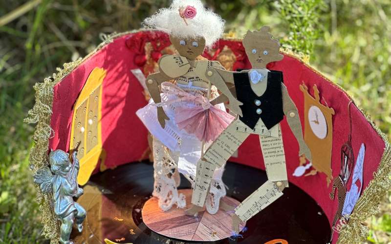 Les petits créateurs donnent vie à deux personnages en papier, Hector Berlioz et son épouse Harriet, prêts à virevolter sur un vinyle transformé en parquet de bal scintillant. Ils créent un décor féérique : dorures, mobiliers, rideaux, lustres avant de repartir avec un univers miniature à jouer sans modération.