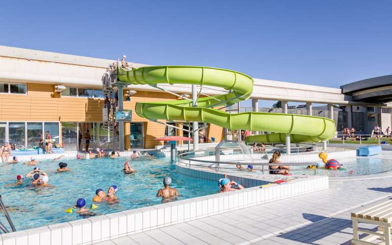 Dotée d’un bassin sportif de 25m, d’un bassin ludique de 200m2 avec banquette à bulles, rivière, champignon, jets massants, d’un toboggan, d’une pataugeoire et d’un toit découvrable, vous pourrez profiter pleinement des joies de l’eau et du soleil aux beaux jours!