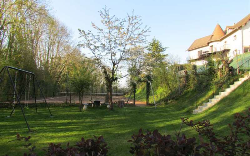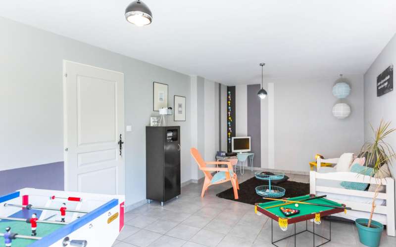 En RDJ : Chambre 4 (2 lits 1 pers), salle d'eau wc, salle de jeux : babyfoot, salon, jeux, terrasse, salon de jardin, barbecue. Chauffage central.
