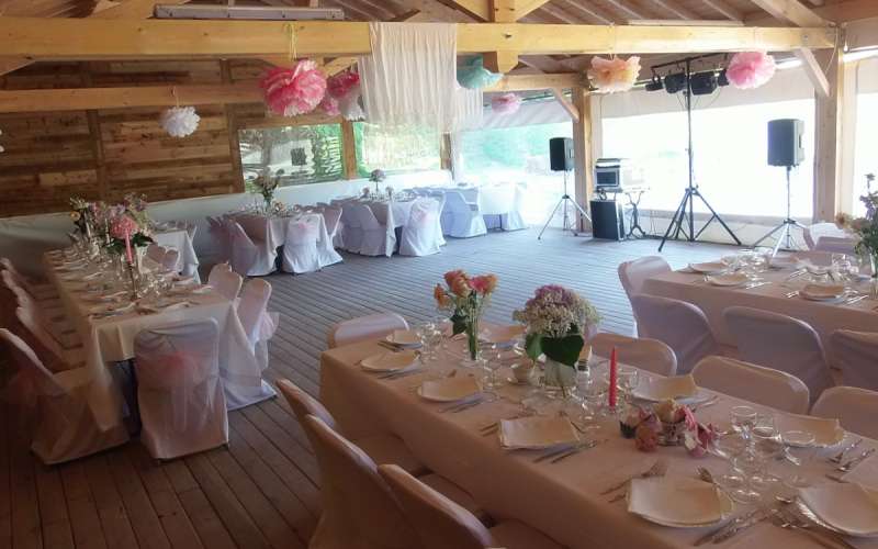 A l’extérieur : Plateforme pour célébrations sous chapiteaux, ou sous tonnelles, organisation de festivités en plein air tels que mariages, baptêmes, anniversaires…