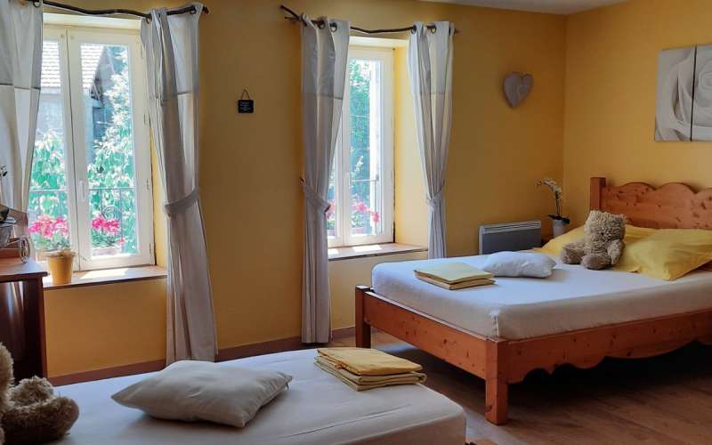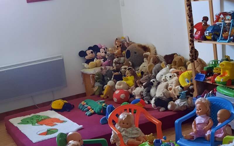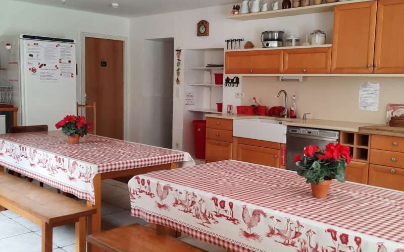 A l’intérieur : actuellement sur 2 niveaux : très grande cuisine équipée, hall d’accueil, salle de réception 80 m², 5 chambres avec salles de bain privatives, détente (salle de jeux, babyfoot, salon TV/vidéo, lecture, jeux de société...)