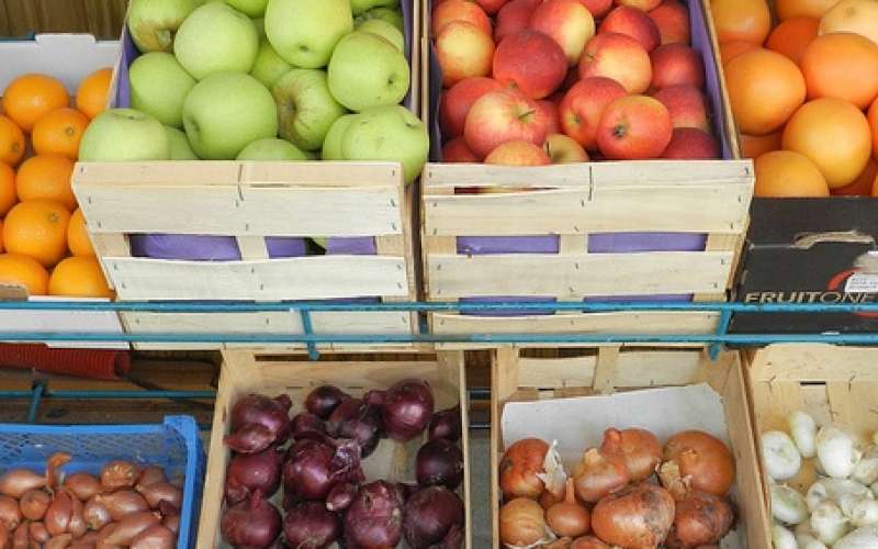 Petit marché avec présence d'un producteur de fruits et légumes, d'un producteur de fromages de chèvres, d'un marchand de poulets rôtis et d'une horticultrice.