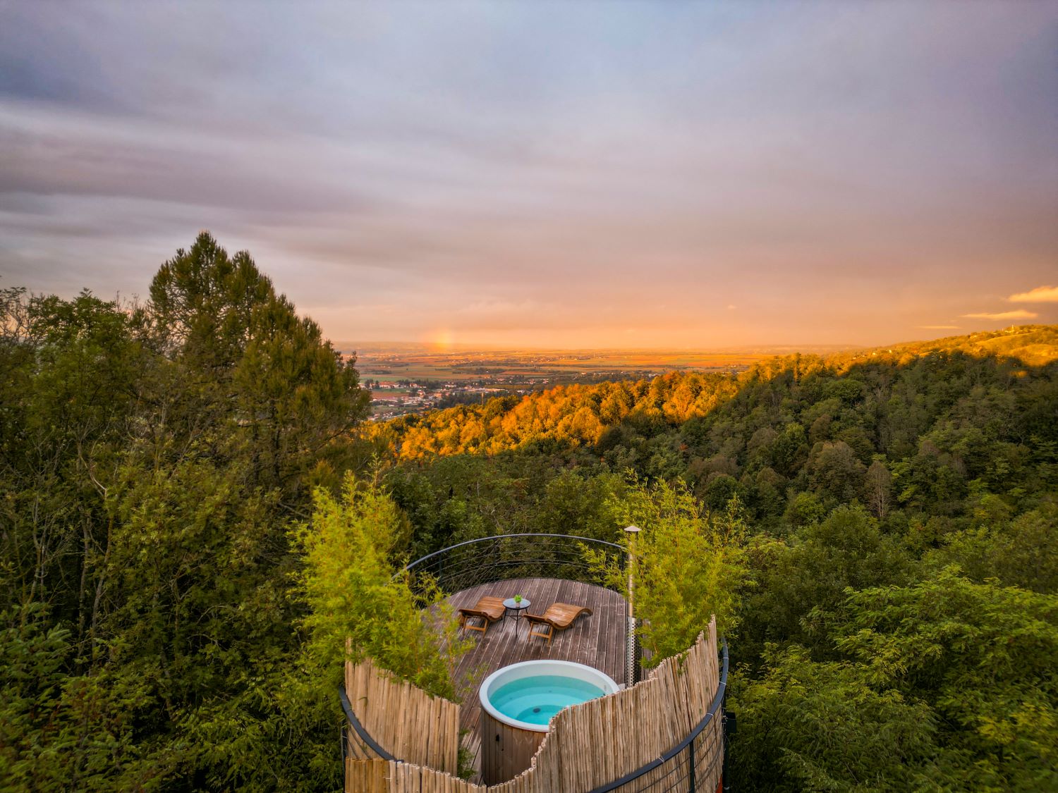 Lodge prestigieuse pour deux personnes avec une baie vitrée circulaire offrant une vue panoramique à couper le souffle. Profitez d’un toit terrasse équipé d’un spa privatif, idéal pour admirer le coucher de soleil dans un cadre idyllique.