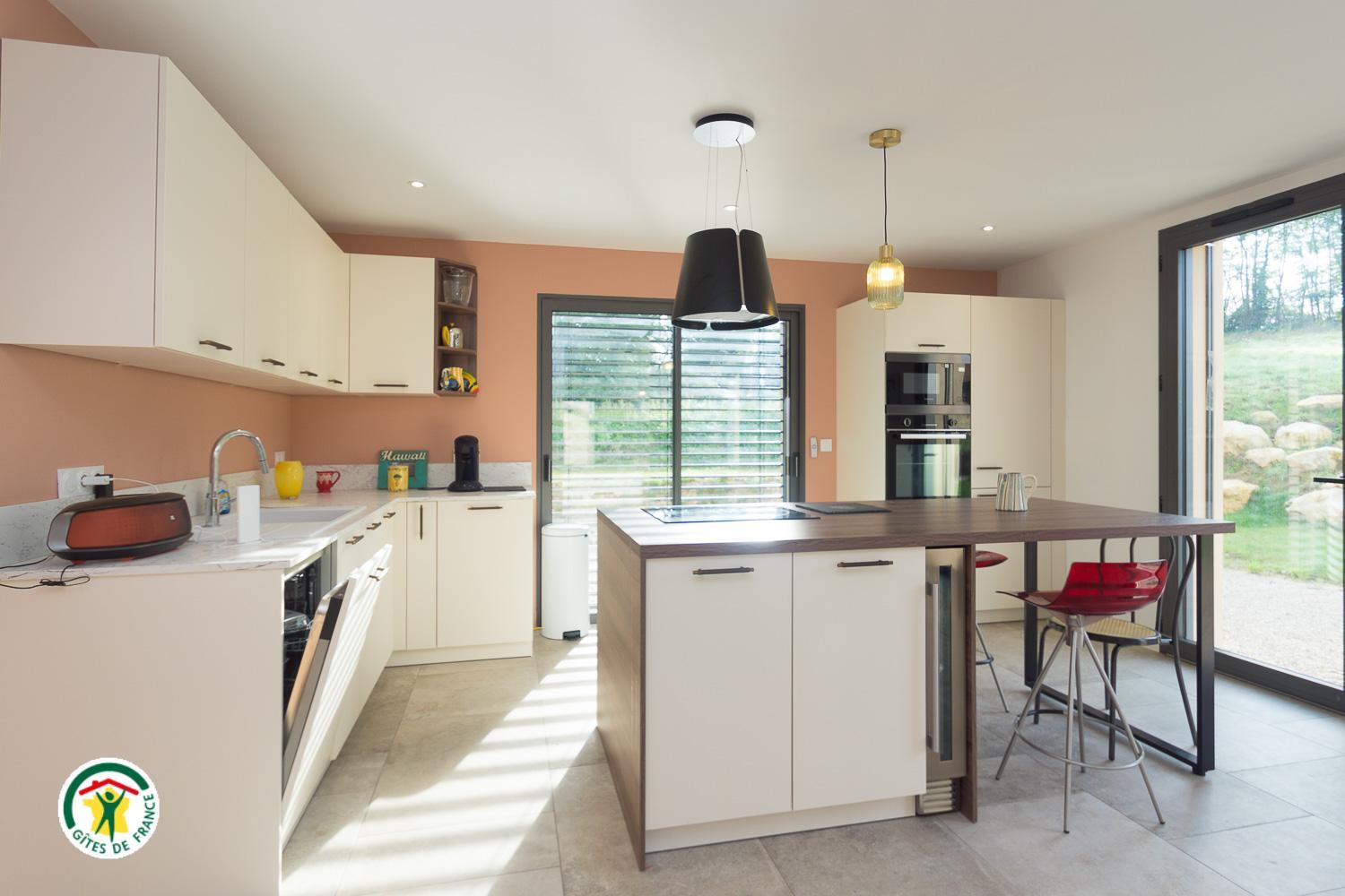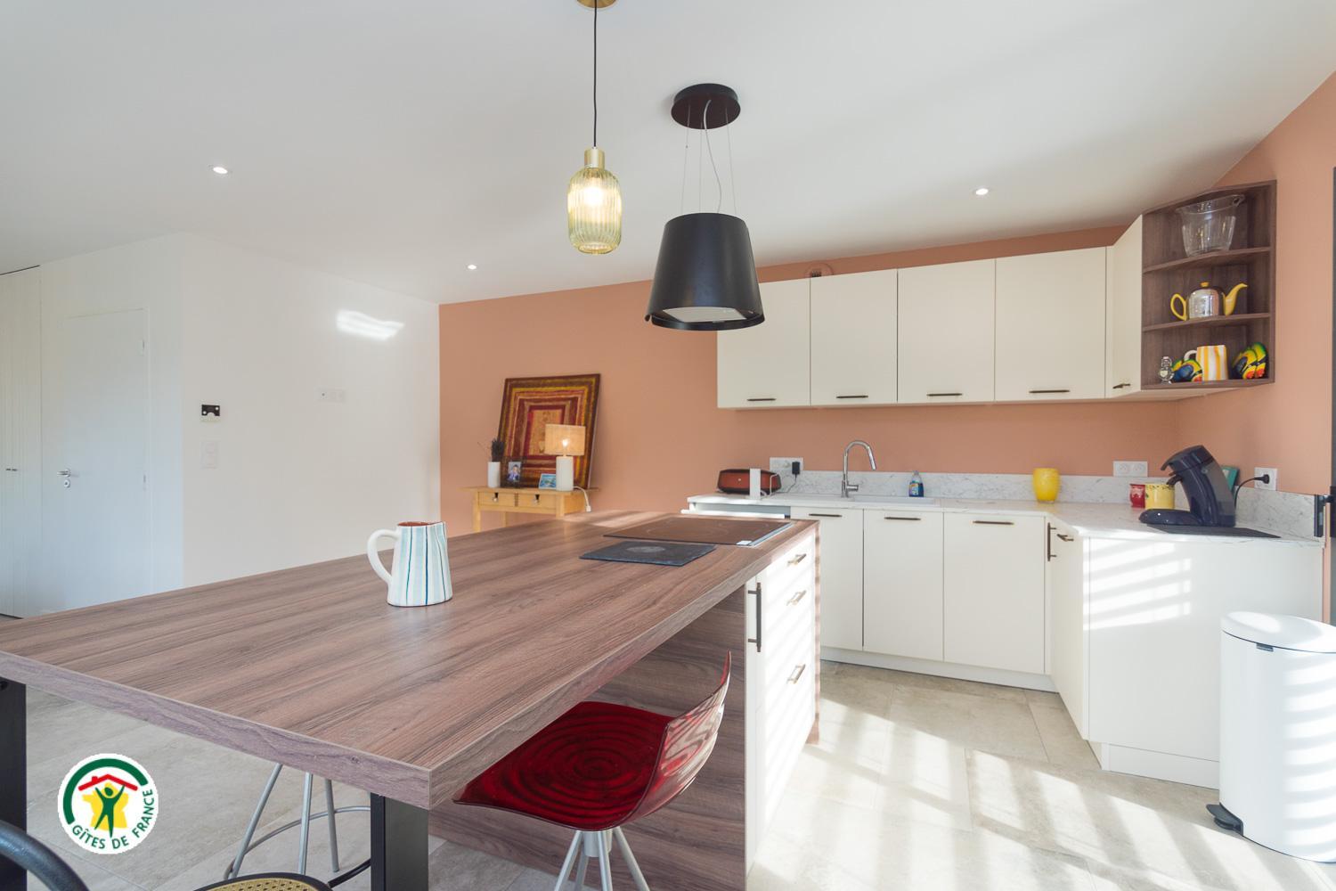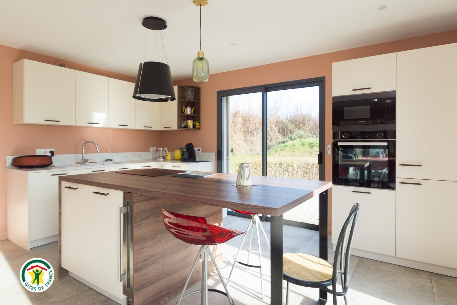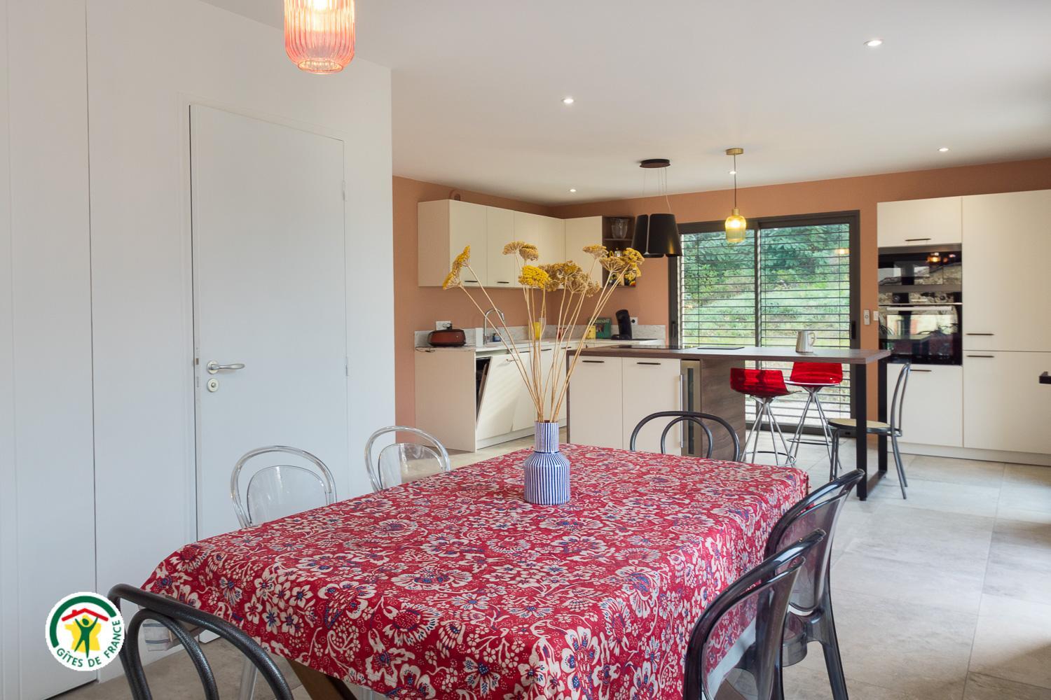 Au rez-de chaussée : salon avec TV et WiFi, séjour-cuisine, grande et belle cuisine toute équipée avec four, hotte, plaque induction, cafetière Senséo, congélateur, grille pain, pierrade... Suite avec 2 lits 90x200 (salle d'eau & wc privatifs), wc.