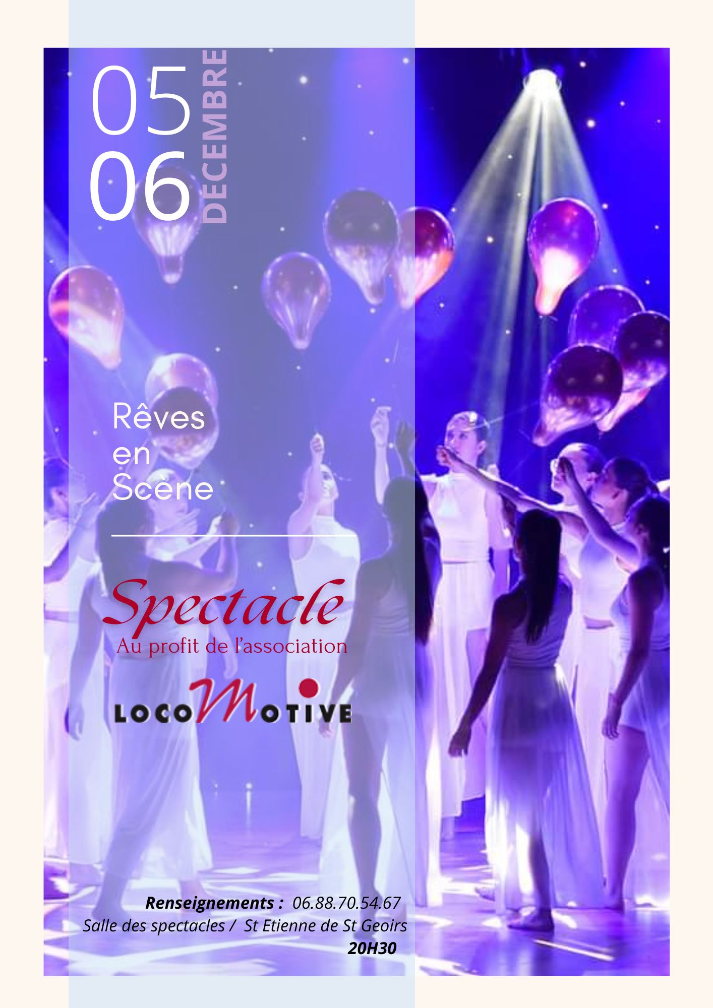 Spectacles de danses par l'association Rêves en scène. 180 élèves de l'école de danse dirigés par Ingrid et Medhi, professeurs, seront présents sur scène pour soutenir l'association LOCOMOTIVE.