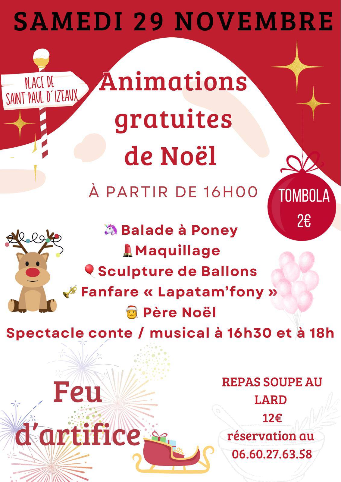 Au programme : balade à poney, maquillage, scultpure de ballons, fanfare lapatam'fony, père-noel, spectacle conte / musical à 16h30 et à 18h Repas soupe au lard Feu d'artifice Tombola 2€