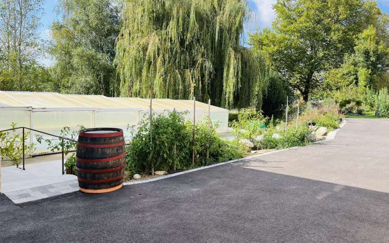 Terrasses ombragées, cuisine d'été avec four à bois et repas champêtre. Parc ombragé et terrain de pétanque pour vos après-midis détente.