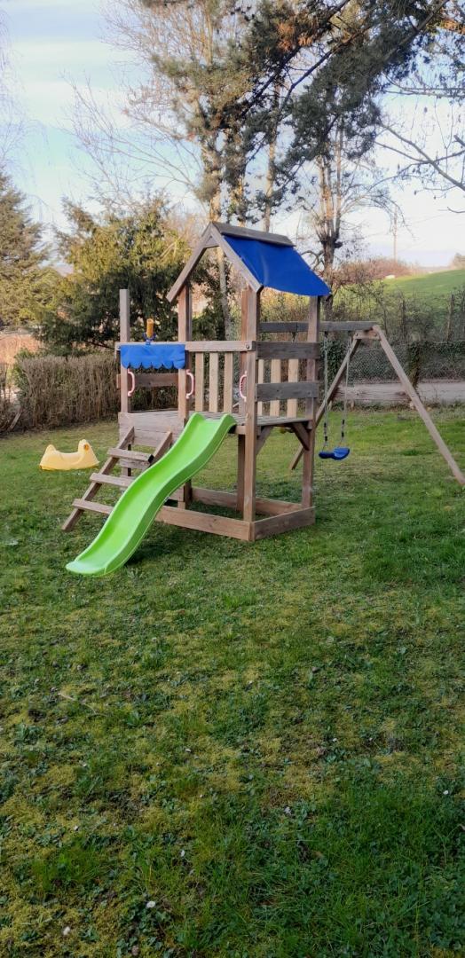 Terrasse et jardin avec salon de jardin, 2 chiliennes, plancha électrique. Chauffage central, parking et jardin privatif clos.