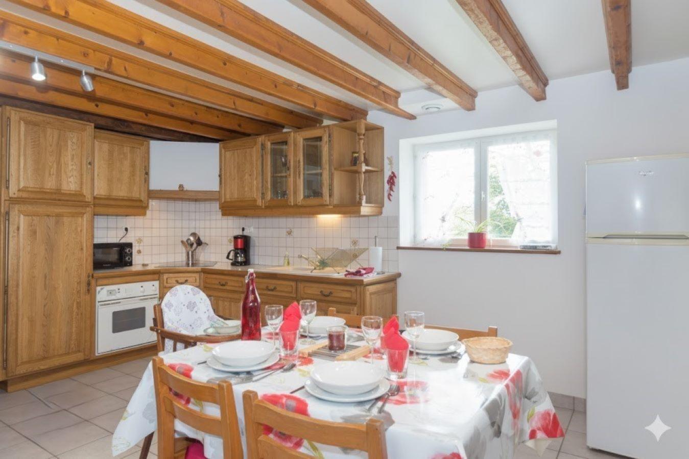 Au rez-de-chaussée : séjour salon avec BZ, TV écran plat, cuisine (plaque induction, four, congélateur, micro-ondes, cafetière filtre, plancha électrique, robot multifonction...), petite salle d'eau et wc.